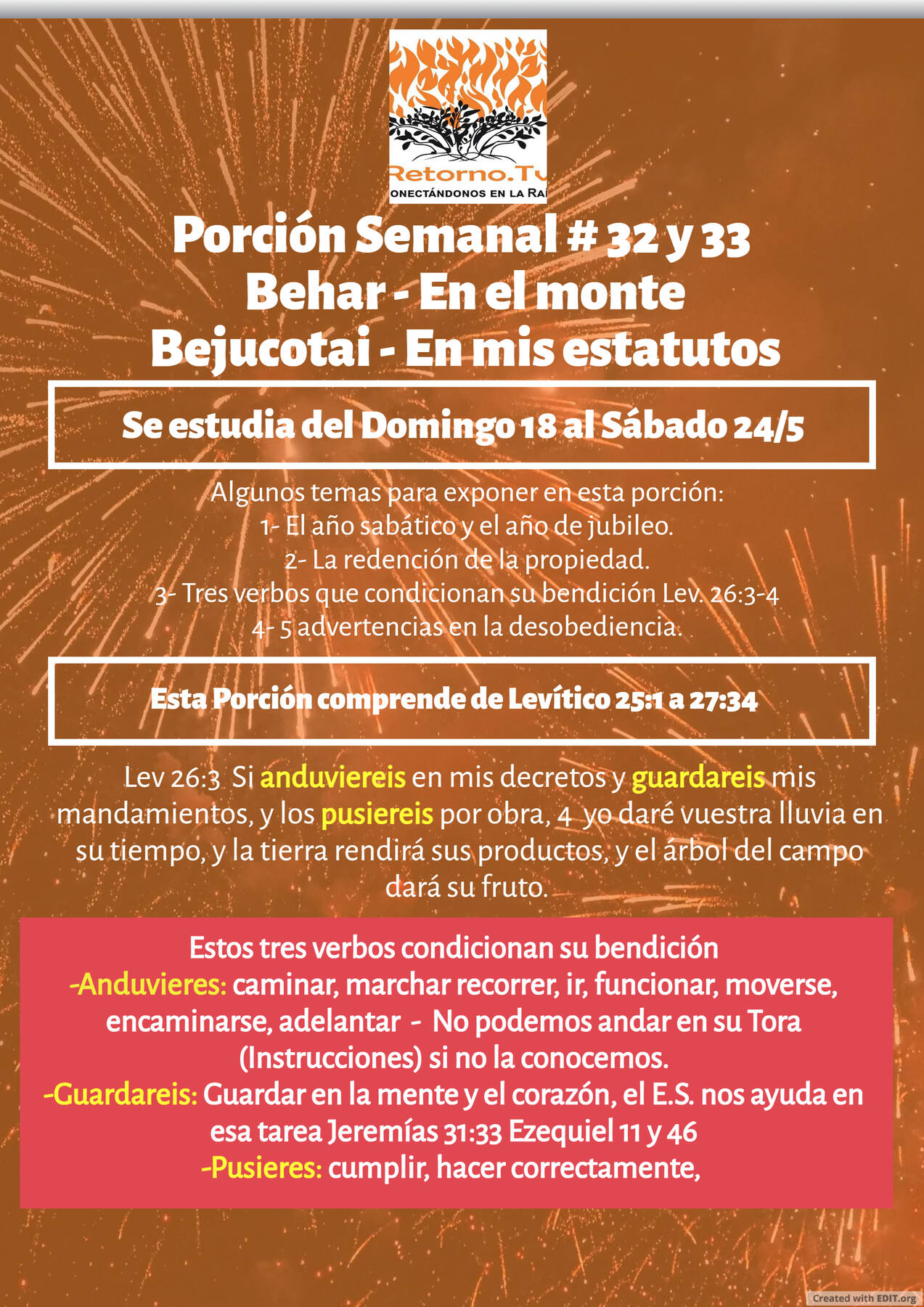 el 18 May 2025 por Enzo Dominguez Sin categoría Porciones 32 y 33 (Parashot) Porcion correspondiente a esta semana, del 18/5 al 24/5.